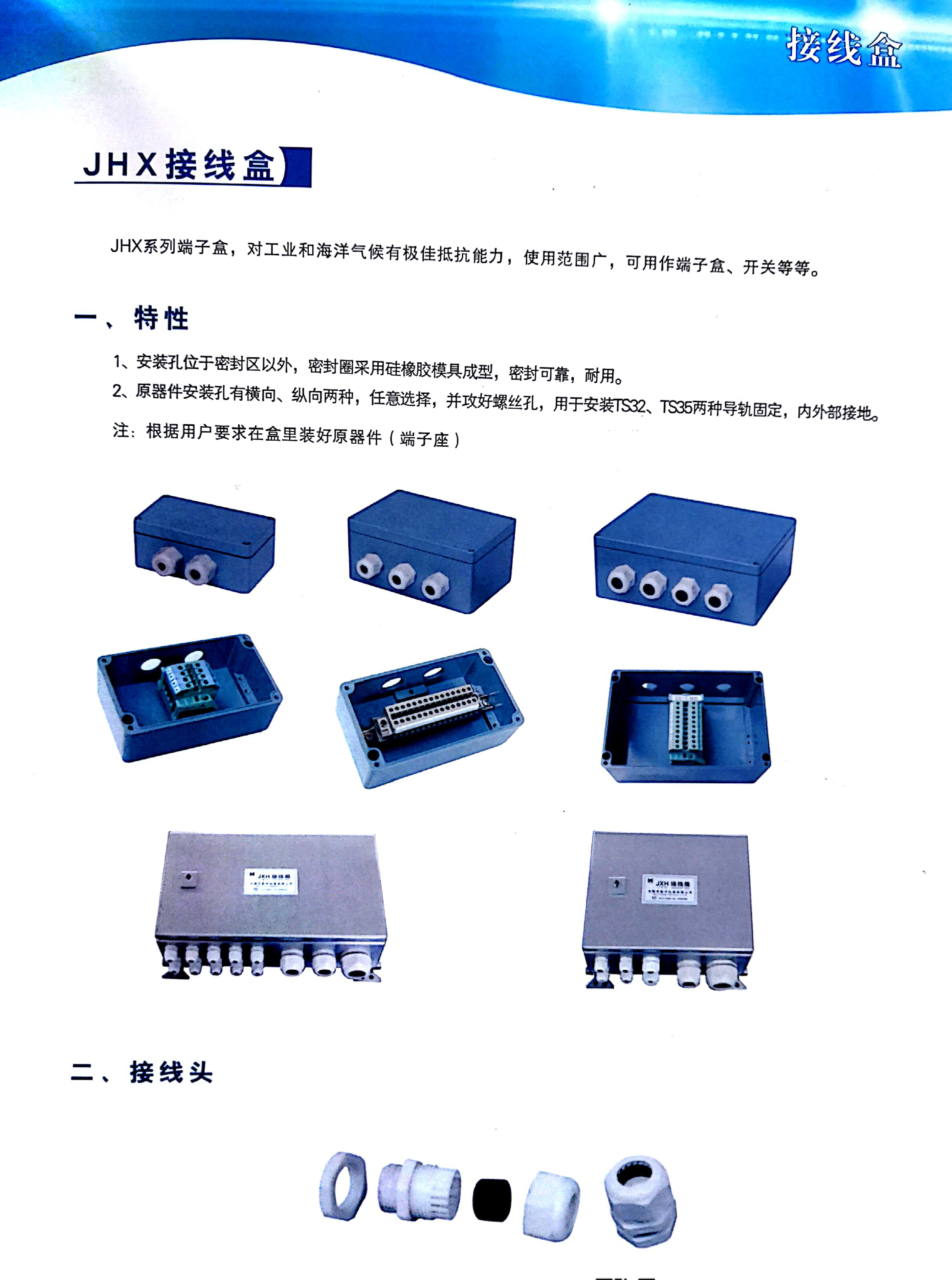 JHX系列接线盒,对工业和海洋气候有极佳抵抗能力,使用范围广,可用做端子盒、开关等等;